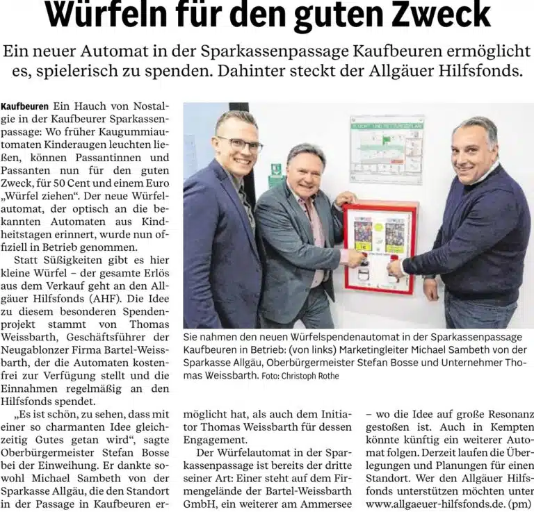 WeiterlesenEin neuer Automat in der Sparkassenpassage Kaufbeuren ermöglicht es, spielerisch zu spenden. Dahinter steckt der Allgäuer Hilfsfonds. Kaufbeuren Ein Hauch von Nostalgie in der Kaufbeurer...
