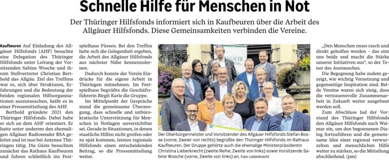 WeiterlesenDer Thüringer Hilfsfonds informiert sich in Kaufbeuren über die Arbeit des Allgäuer Hilfsfonds. Diese Gemeinsamkeiten verbinden die Vereine. Kaufbeuren Auf Einladung des Allgäuer Hilfsfonds (AHF)...